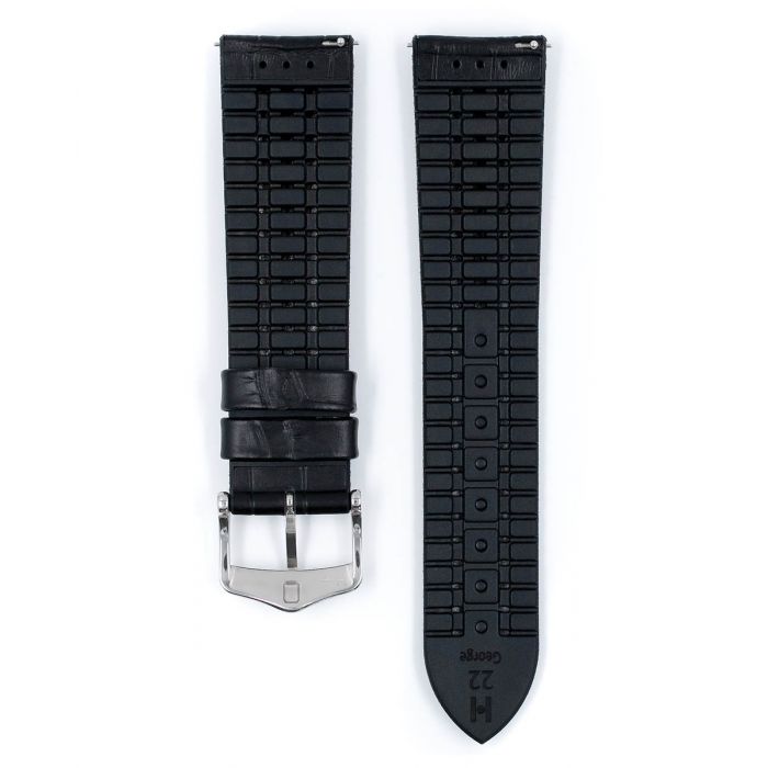 Cinturino nero Hirsch George impunture bianche 22mm L, trattato per l'acqua, fodera inferiore in caucciù. Il cinturino è di qualità superiore e venduto completo di fibbia Hirsch come da foto.